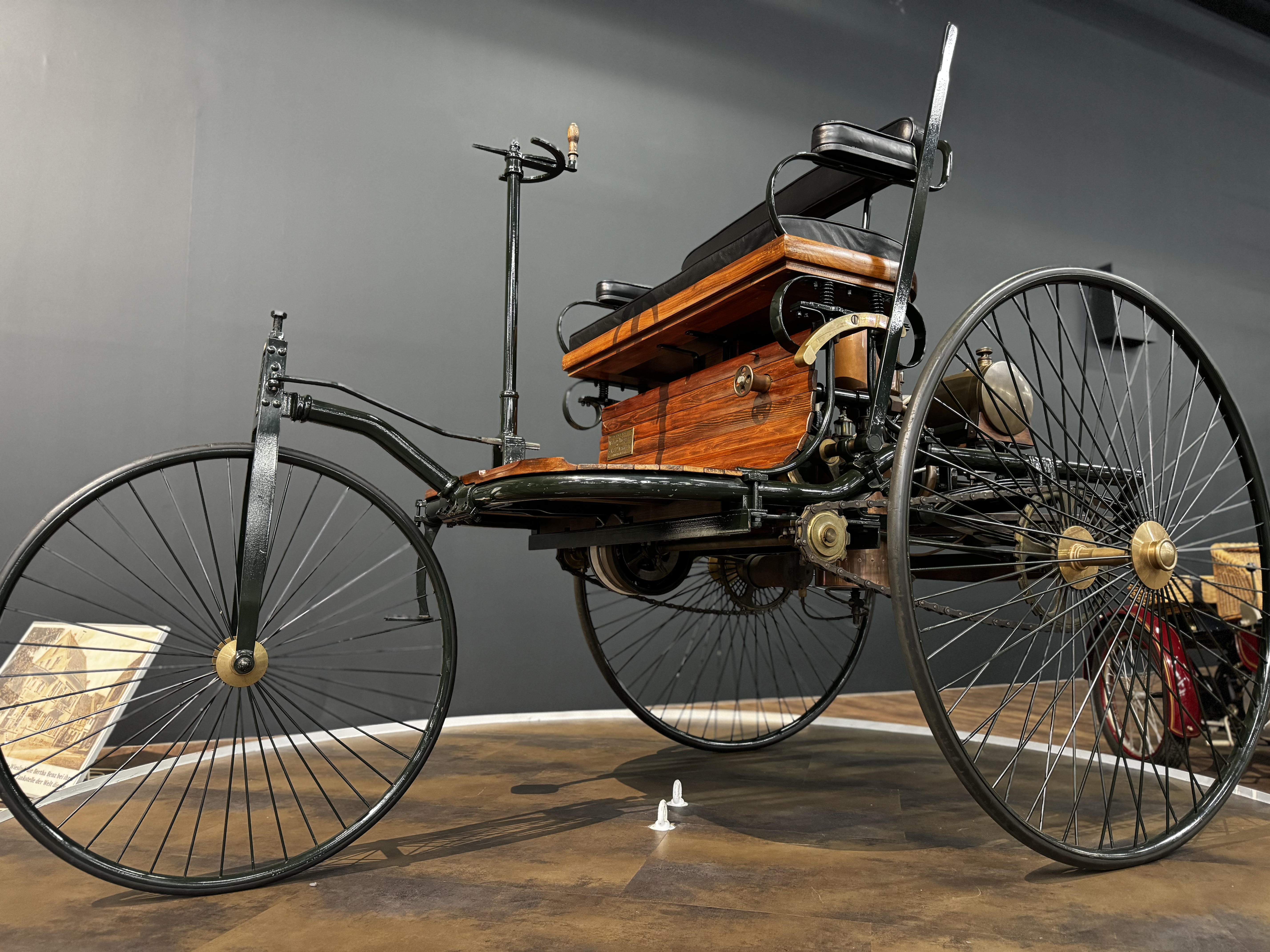 Im Technik Museum Sinsheim ist ein originalgetreuer, voll funktionsfähiger Nachbau des berühmten Benz-Dreirads (Benz Motorwagen Nr. 1) von 1886 zu sehen.